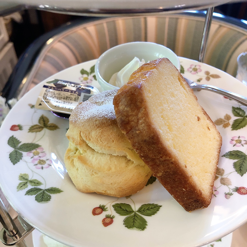 2段目の皿にはスコーンとパウンドケーキかな。ホイップクリームとブルーベリージャムが添えられています