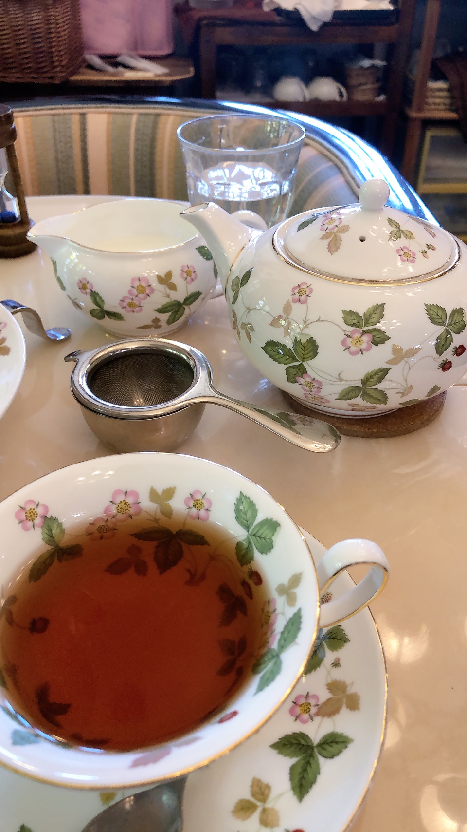 万博ではどこぞの国がアフタヌーンティーで炎上しておられましたが、こちらはちゃんと陶器のポットにカップ、継ぎ足しのお湯も先方からお声がけの上でちゃんと出ます。ありがたい。