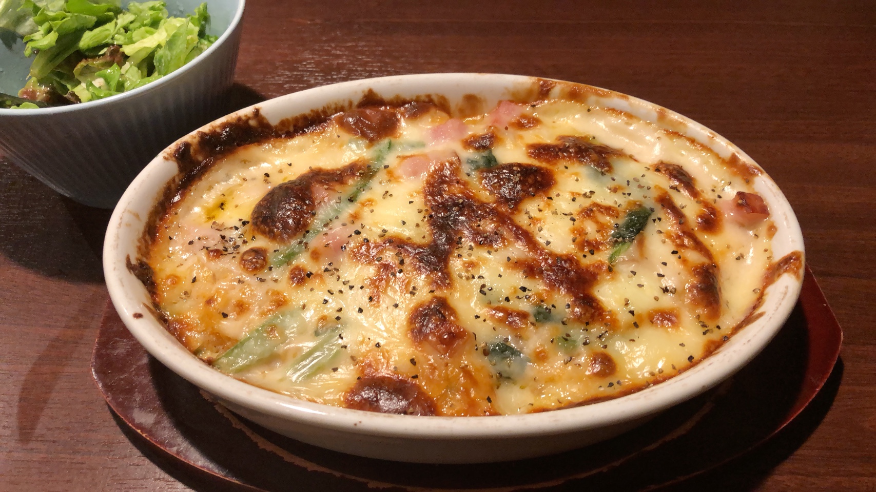 オーダーしたのはベーコンとほうれん草のドリア、サラダ付き。
