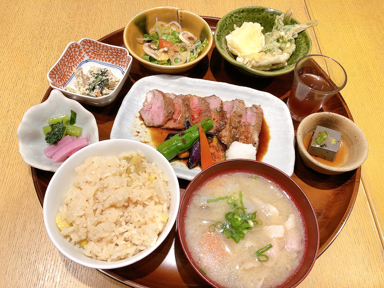 地下の「寅福」というお店が開いてたので、牛ステーキをメインにしたスタミナ定食にしました。