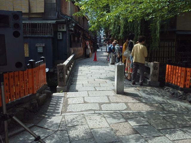 着物を着てる女の人とスーツ姿の男性が並んで歩くもの。あと通行人に舞妓姿の人も。