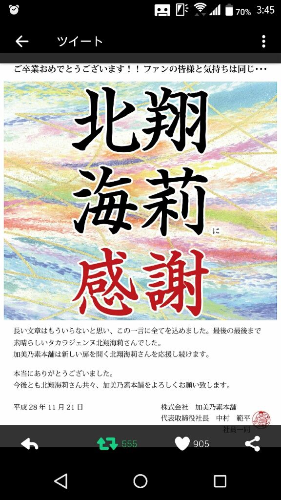 大きく「北翔海莉に感謝」の文字、背景は例の緞帳柄というのがじわじわきます。
