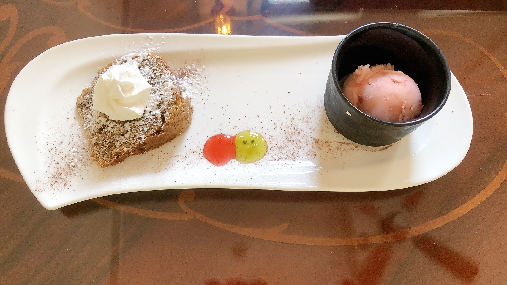 デザートは紅茶のパウンドケーキといちごのアイス。