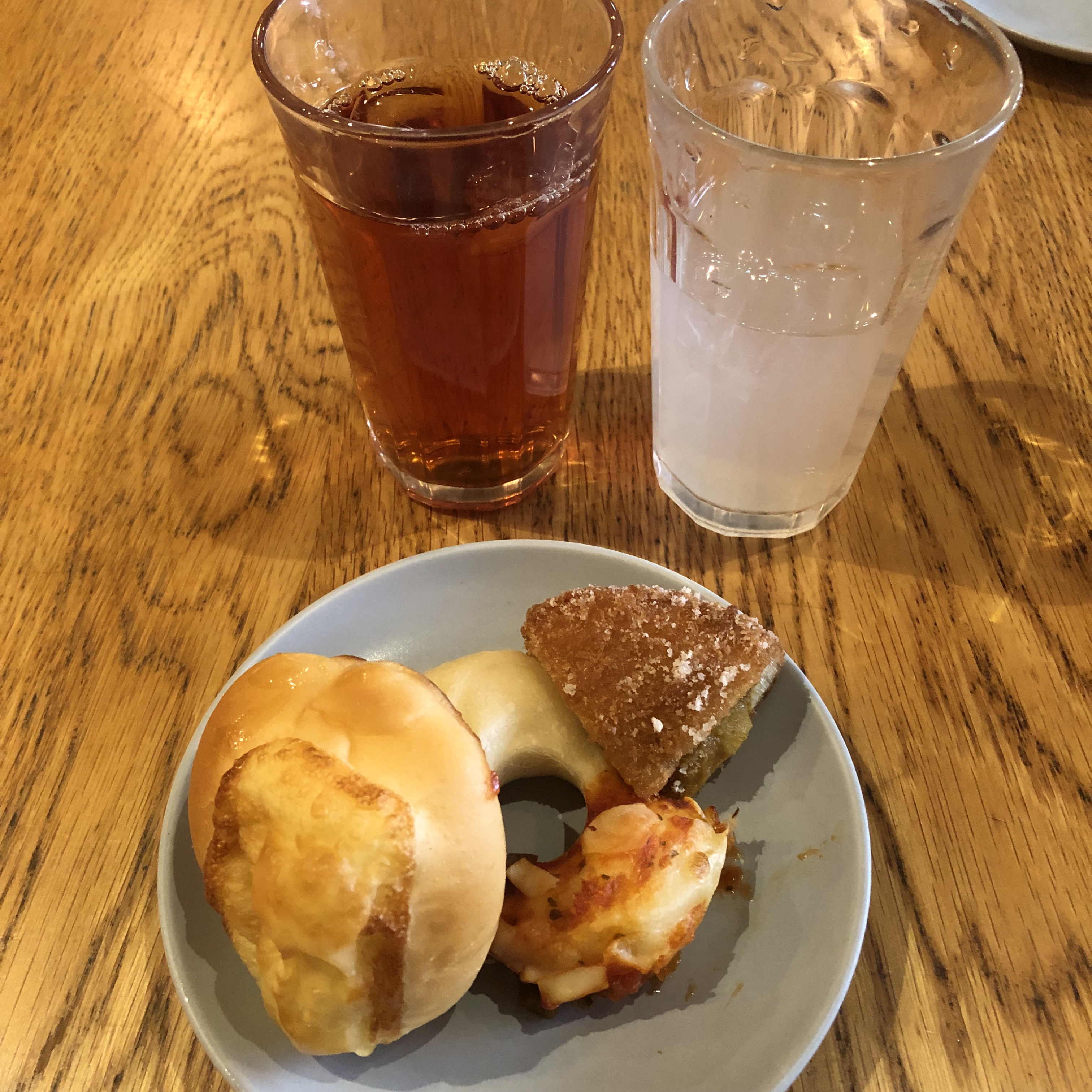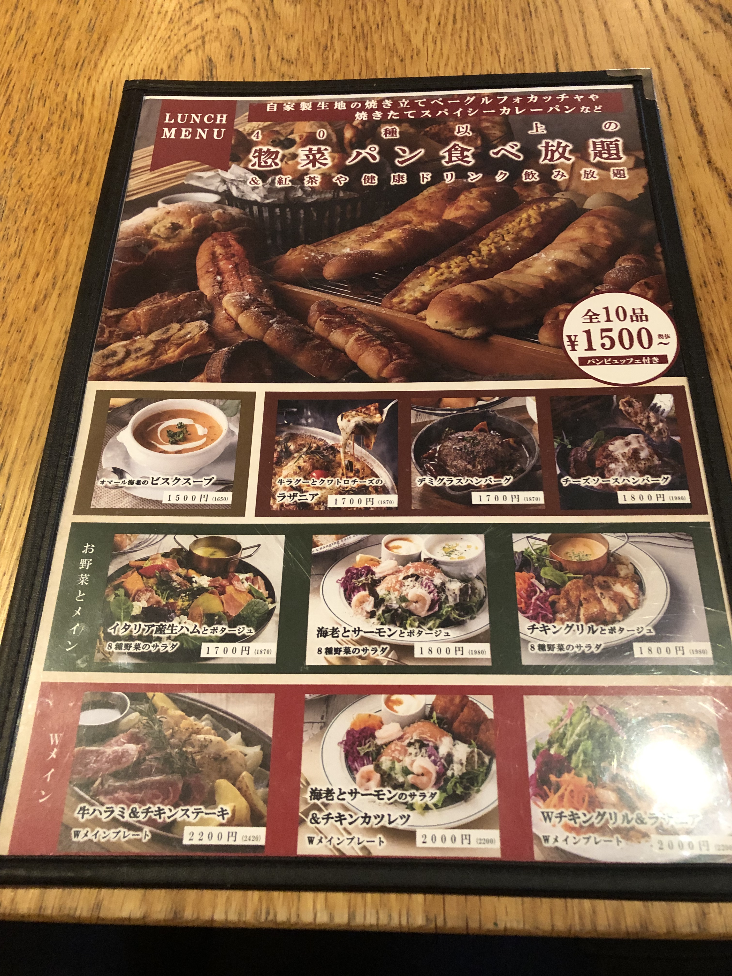 総菜パン食べ放題のパンビュッフェつきで、パンはこまめに商品は入れ替えられ、常時10種くらいがあります。私も10個くらい食べた。