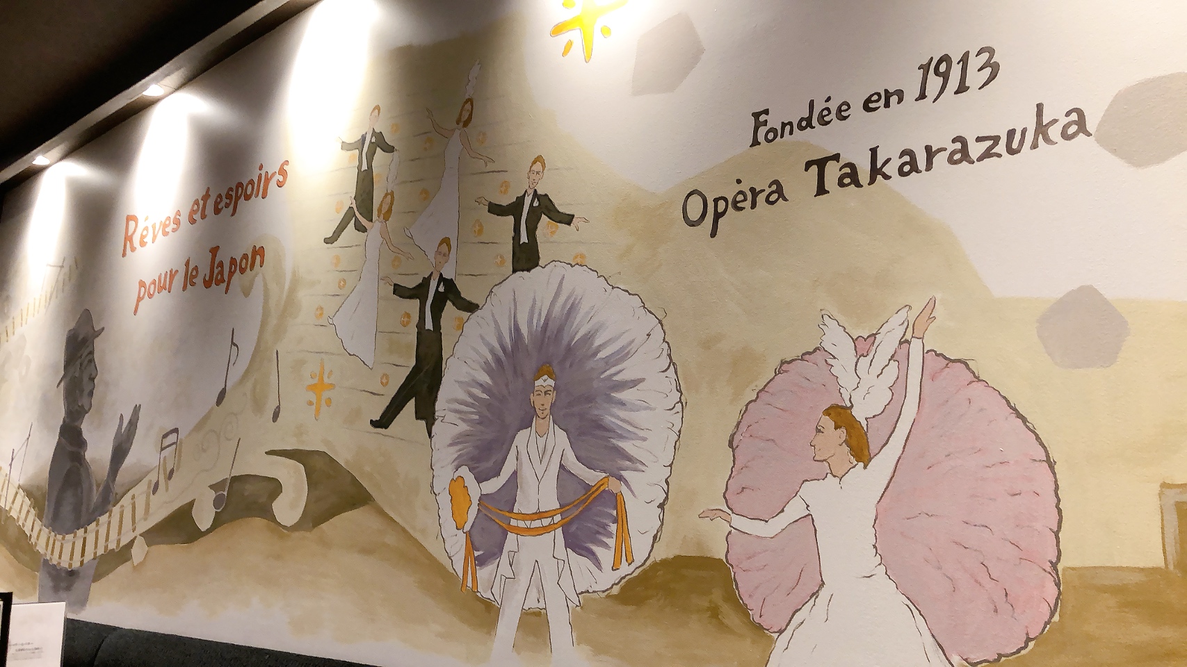 奥には宝塚らしく、歌劇の大きな壁紙があります。その席に陣取らせてもらい、11時までオーダーできるモーニングを食べつついろいろと書き物をしつつ、時間をつぶします。