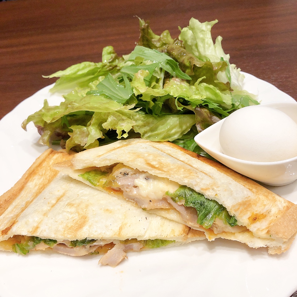チキンとトマトソースのホットサンドのスペシャルモーニングにしました。ゆでたまごとサラダがついてきます。