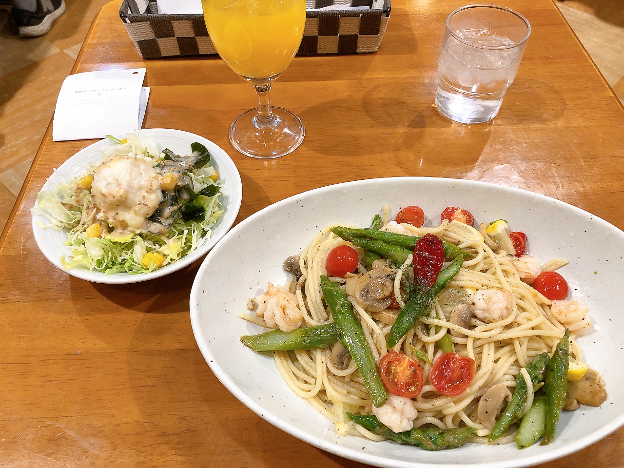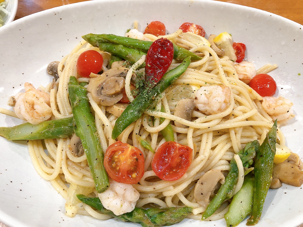 アスパラとトマトとシーフードのレモン風味のパスタのセットにしました。