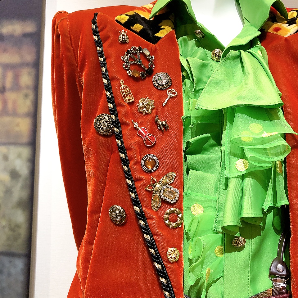 襟につけた小さな飾りが、楽器、鳥かご、カギ、蜂など。