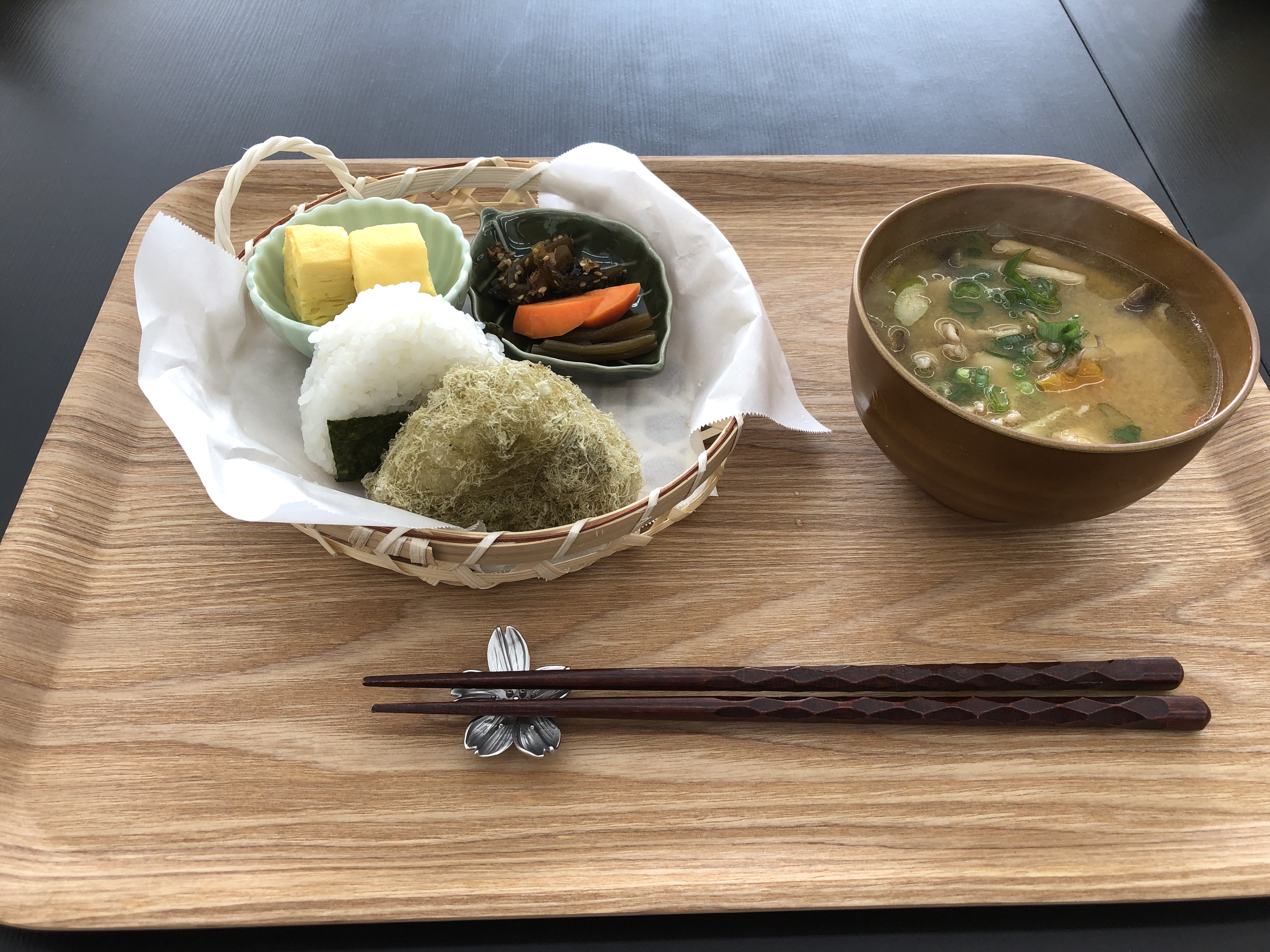 モーニングセットはおにぎり2個に野菜の小鉢、玉子焼き、豚汁。コーヒーも付きます。