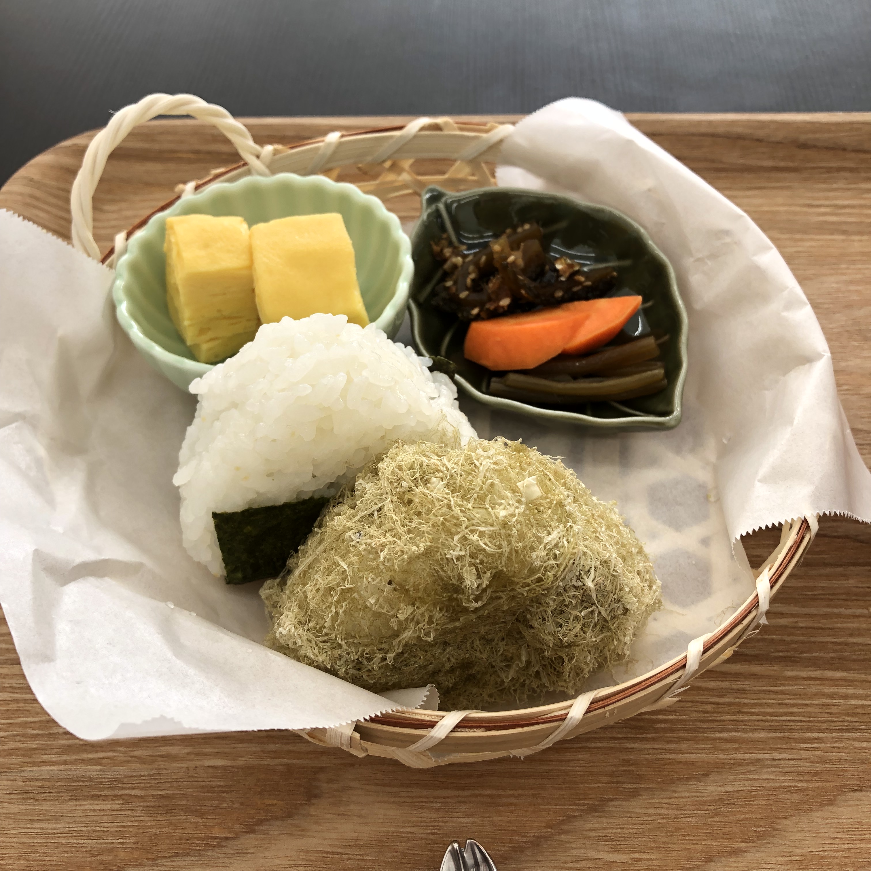 おにぎりは昆布のつくだにを入れて海苔を巻いたのと、梅干しにとろろ昆布を巻いたのの2種。