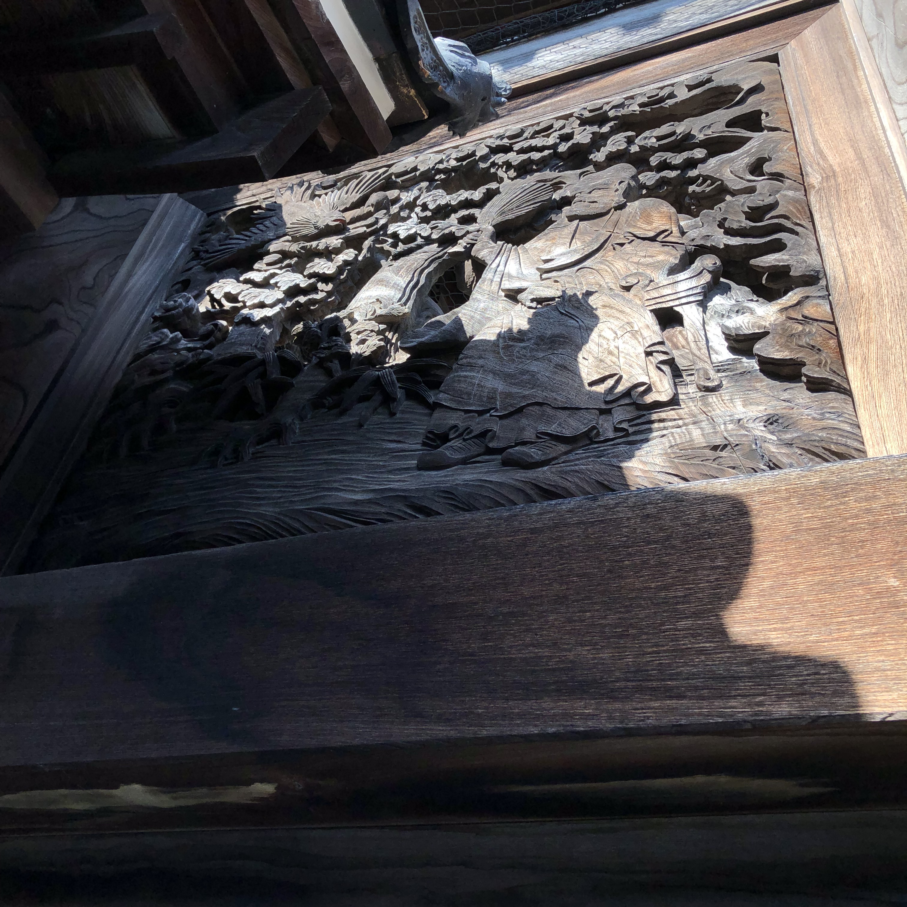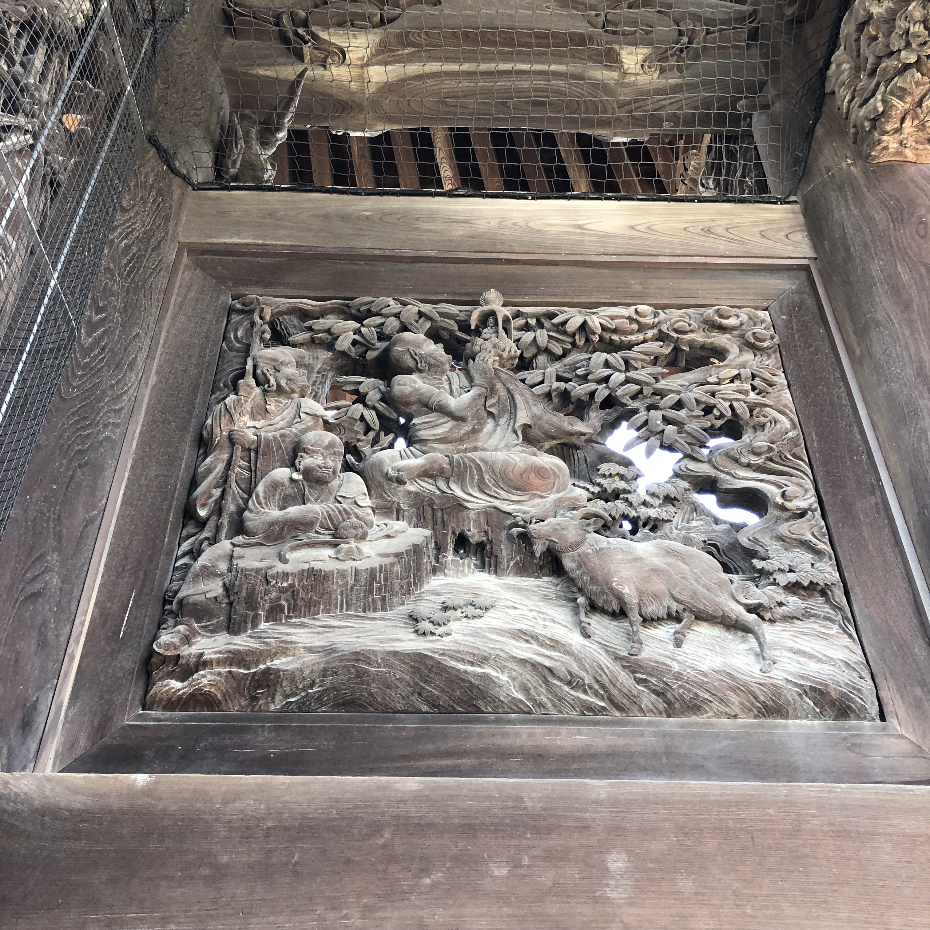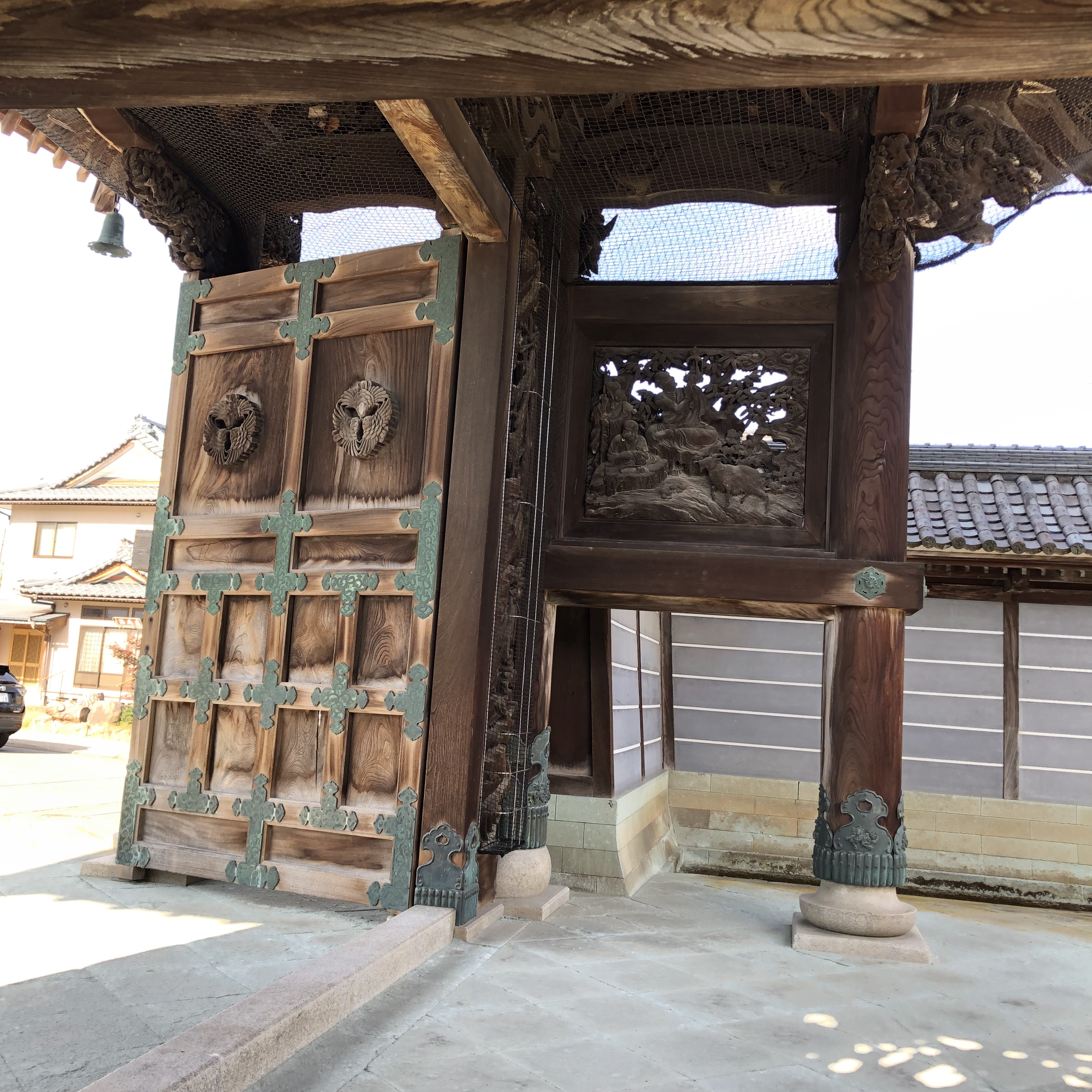 総けやき造りの山門の彫刻がすごい。